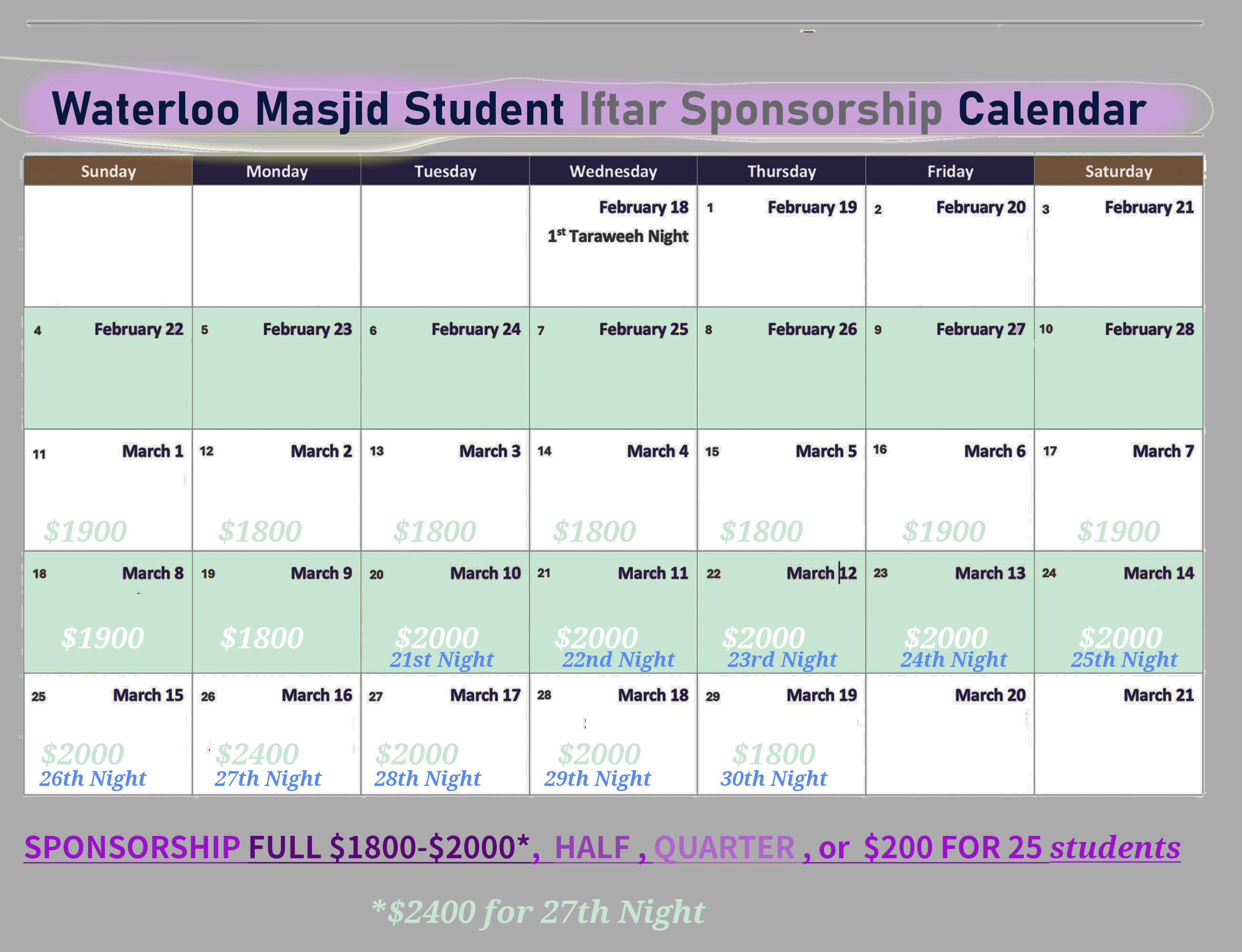 Waterloo Masjid Iftar program sponsorships are open, including tor the last ten nights. ( InshaAllah it will be posted in the masjid and updated with available spots ). Groups of friends or relatives can also get together to sponsor a day, or half or quarter of a day. $200 covers about 25 students eating iftar for a day.
